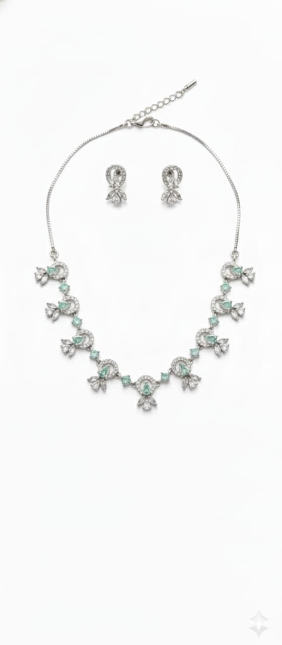 Elegant mint green necklace set featuring sparkling white stones with soft mint green accents. Comes with matching stud earrings, lightweight design, perfect for parties, weddings, and festive wear.