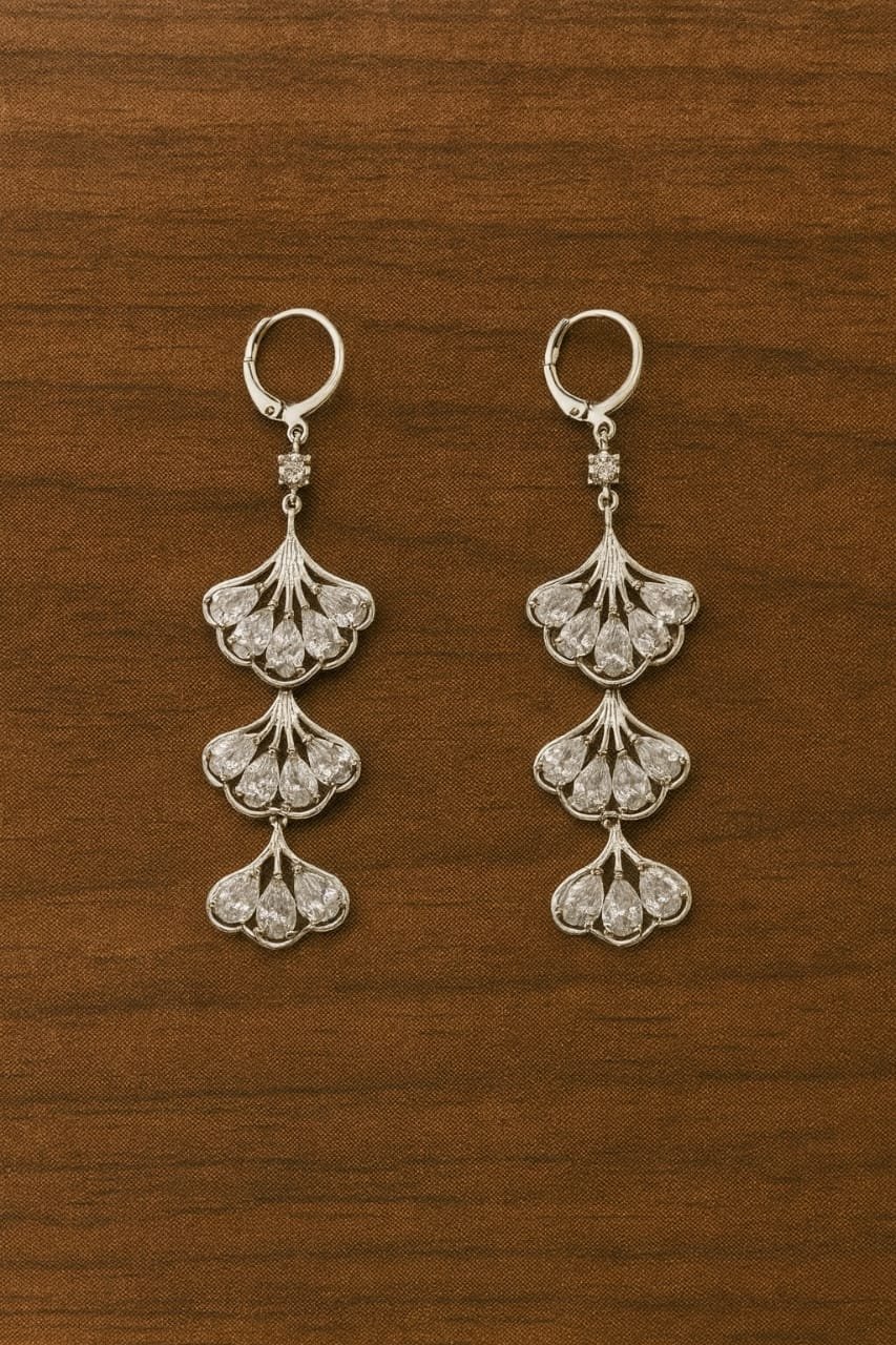 Enhance your elegance with these beautifully crafted silver-tone long drop earrings, designed with sparkling cubic zirconia stones arranged in a graceful layered pattern. The leaf-inspired design with multiple dangling segments creates a luxurious look that moves beautifully with every step.