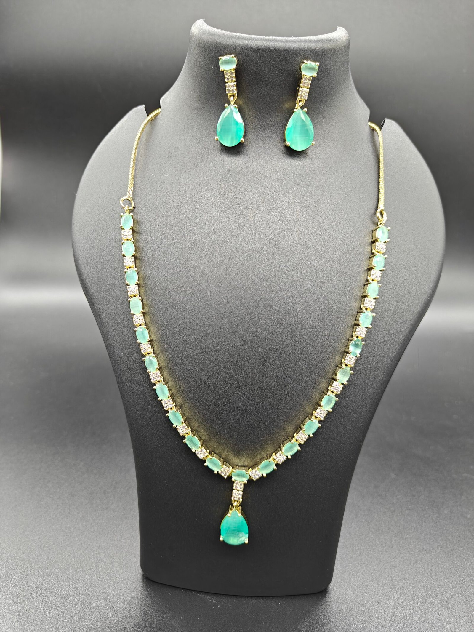 • Necklace: The necklace features a continuous line of small, rectangular (baguette-cut) stones in a vibrant emerald green or dark jade green color. Each green stone is likely separated or bordered by tiny, sparkling clear stones (Cubic Zirconia or rhinestones). The entire setting and the chain are finished in a gold-tone plating. A central focal point is a larger, teardrop-shaped green stone pendant dangling from the main chain.
